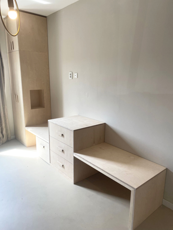 OverzichtEen wandmeubel op maat met volop opberg, zit en speelruimte gemaakt van Berken Mulitplex.