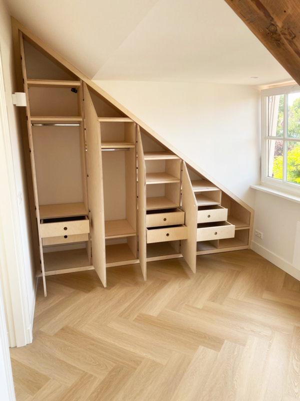 OverzichtEen zolderkast op maat met volop opbergruimte, zowel de binnenkant als de buitenkant is gemaakt van Berken Multiplex.